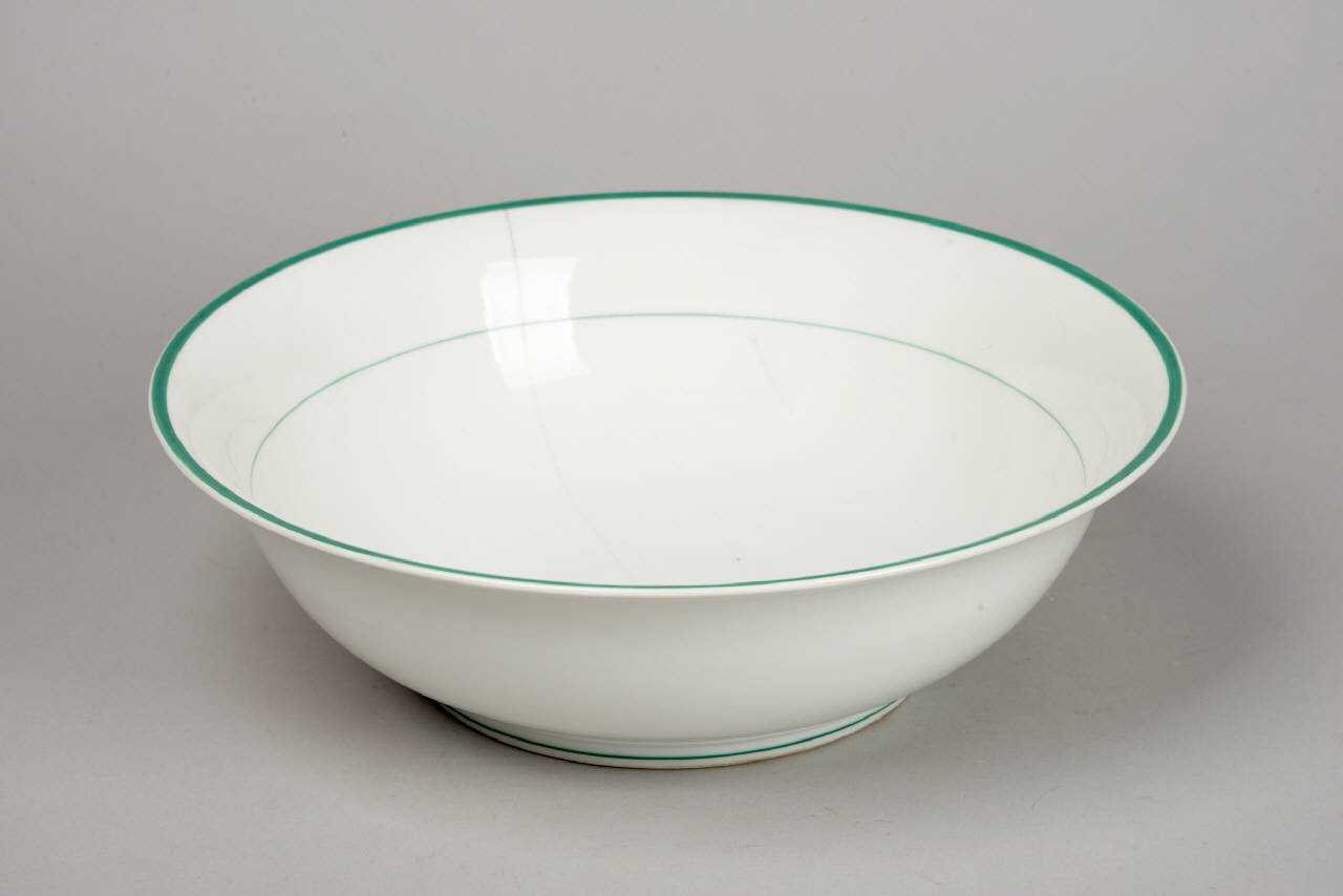 Catino circolare, a parete liscia rivolta, e anello d'appoggio; profili delle forme decorati in verde.