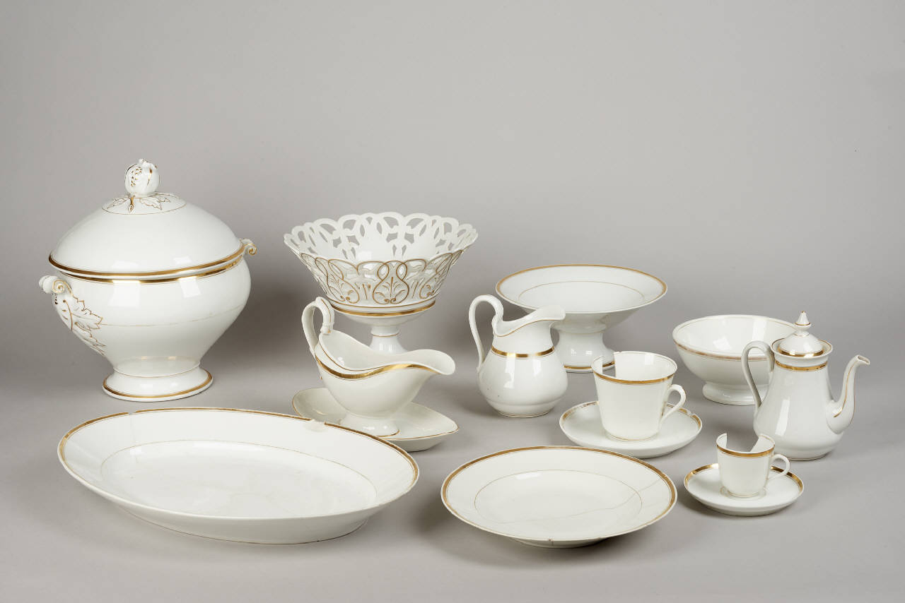 Servizio da tavola a parete liscia e sottile con una decorazione riservata a filetto e sottile fascia in monocromia oro. Si compone di: due caffettiere, una lattiera, una zuccheriera; undici tazze di diverse forme e dimensioni; sei piattini, una zuppiera, un piatto fondo; un grande piatto ovale da servizio; una fruttiera, due alzate e una salsiera