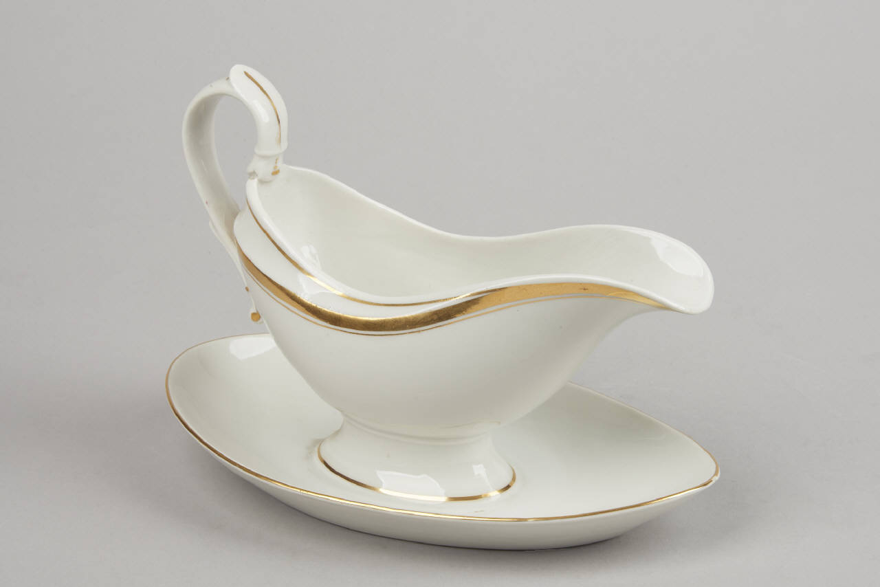 Salsiera con decorazione riservata a filetto e sottile fascia in monocromia oro.