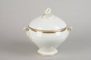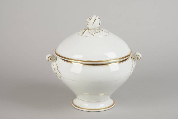 Zuppiera con decorazione riservata a filetto e sottile fascia in monocromia oro; due anse e un coperchio con manico modellato come un bocciolo di fiore.