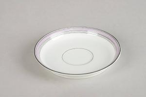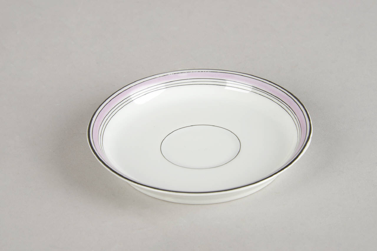 Piattino in porcellana bianca. La decorazione vede correre sottili filetti neroi a sottolineare gli stretti nastri colorati in monocromia su diversi accenti cromatici rosa - viola che corrono sui rigonfiamenti plastici.
