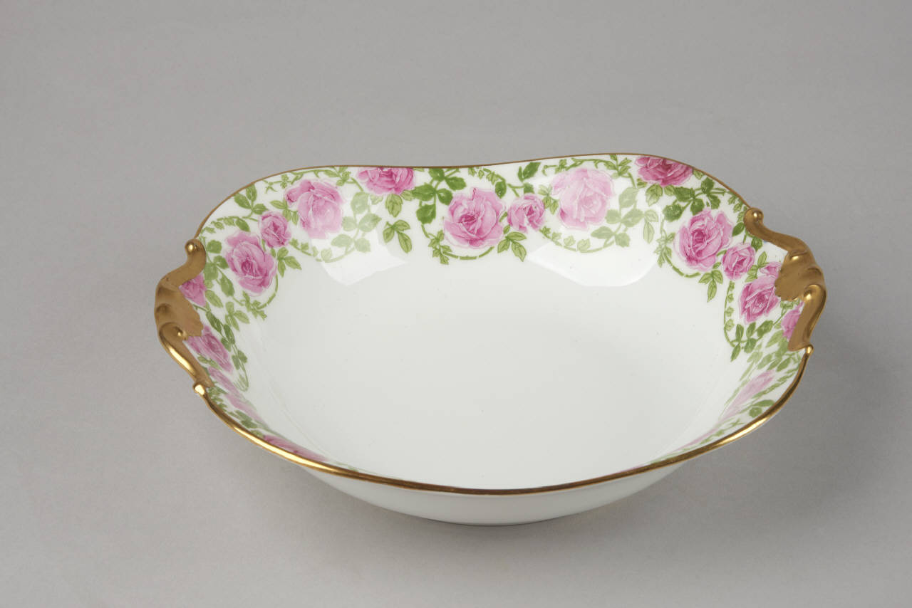 Vasca quadrata polilobata con prese modellate a stampo. L'ornato è costituito da rose di colore rosa, legate tra loro da un filo fogliato a volute e pendoni (di diverso disegno) in monocromia verde pisello; gli orli e i passaggi di piano sono sottolineati da fili d'oro.