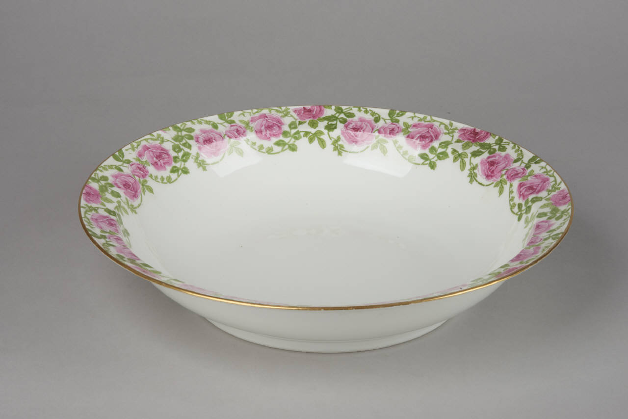 Piatto da portata tondo. L'ornato è costituito da rose di colore rosa, legate tra loro da un filo fogliato a volute e pendoni (di diverso disegno) in monocromia verde pisello; gli orli e i passaggi di piano sono sottolineati da fili d'oro.