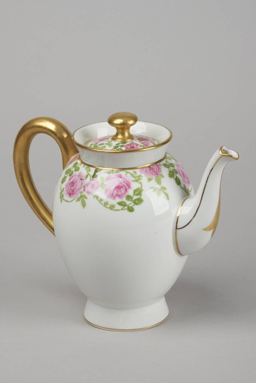 Caffettiera con coperchio. L'ornato è costituito da rose di colore rosa, legate tra loro da un filo fogliato a volute e pendoni (di diverso disegno) in monocromia verde pisello; gli orli e i passaggi di piano sono sottolineati da fili d'oro.