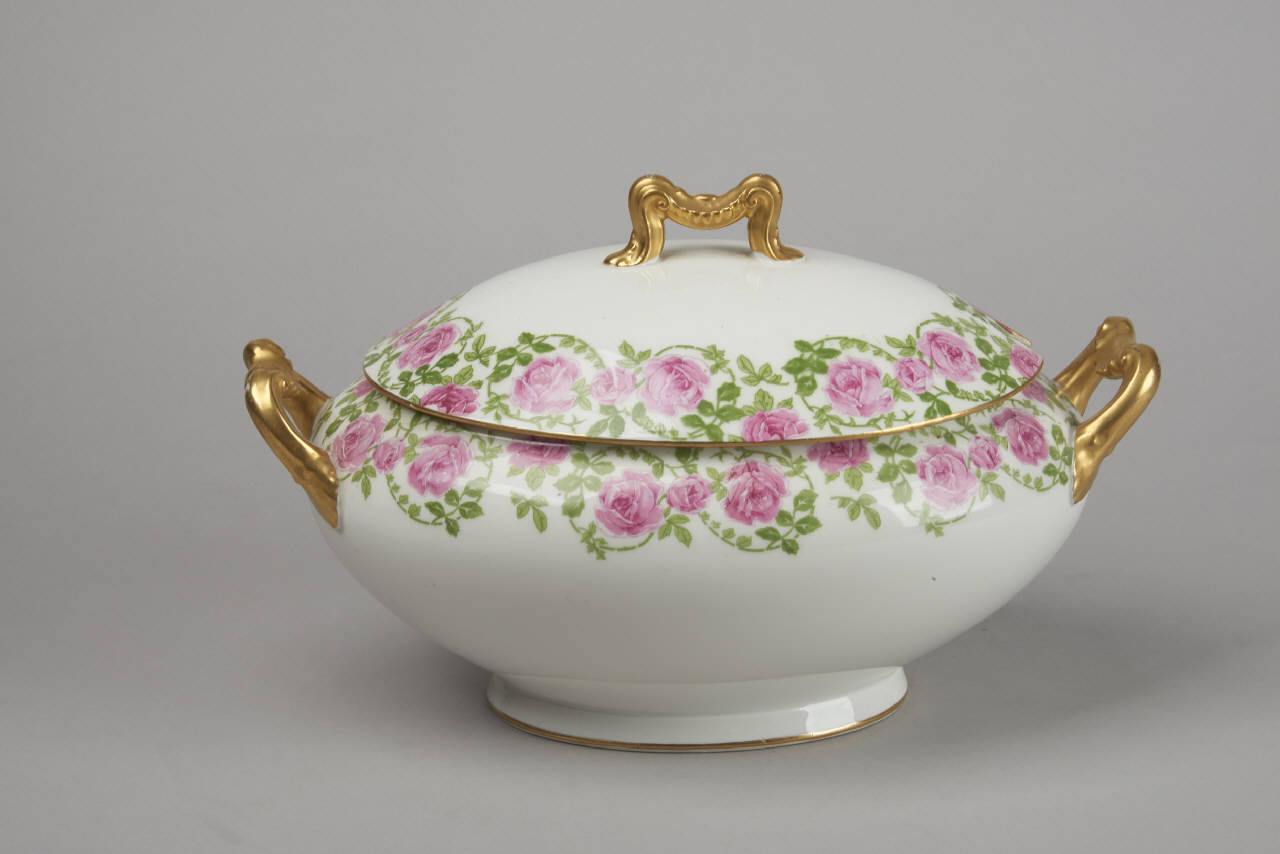 Zuppiera con anse e coperchio. L'ornato è costituito da rose di colore rosa, legate tra loro da un filo fogliato a volute e pendoni (di diverso disegno) in monocromia verde pisello; gli orli e i passaggi di piano sono sottolineati da fili d'oro.