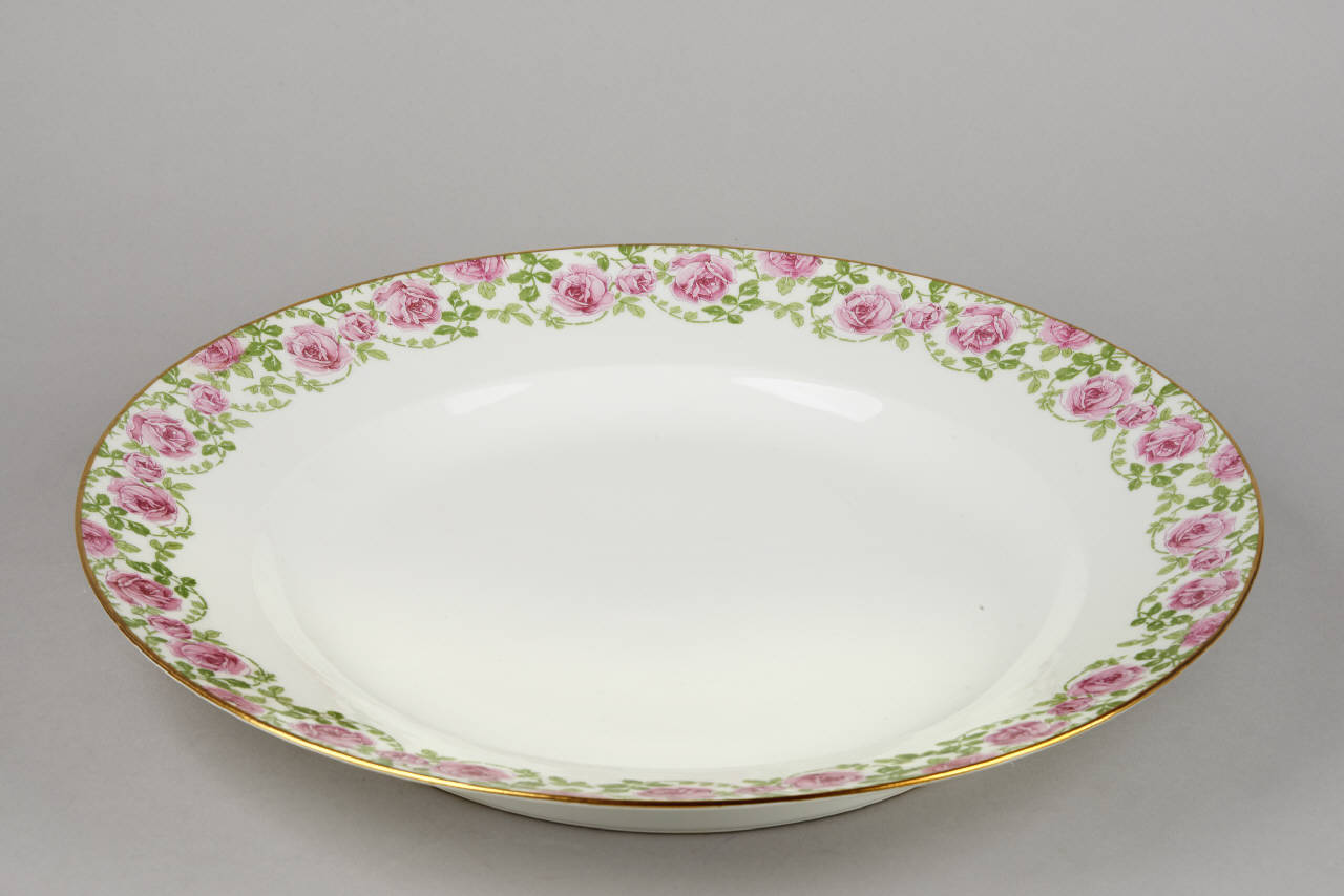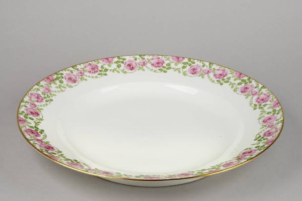 Piatto piano ovale. L'ornato è costituito da rose di colore rosa, legate tra loro da un filo fogliato a volute e pendoni (di diverso disegno) in monocromia verde pisello; gli orli e i passaggi di piano sono sottolineati da fili d'oro.