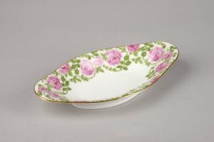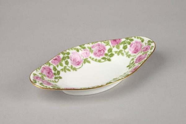 Piatto con bordi rialzati. L'ornato è costituito da rose di colore rosa, legate tra loro da un filo fogliato a volute e pendoni (di diverso disegno) in monocromia verde pisello; gli orli e i passaggi di piano sono sottolineati da fili d'oro.