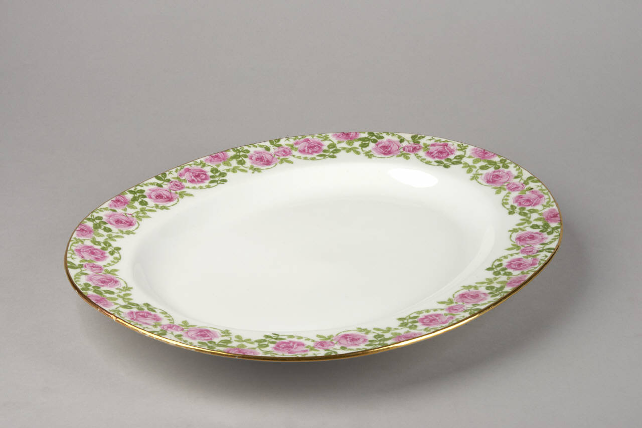 Piatto ovale da portata. L'ornato è costituito da rose di colore rosa, legate tra loro da un filo fogliato a volute e pendoni (di diverso disegno) in monocromia verde pisello; gli orli e i passaggi di piano sono sottolineati da fili d'oro.
