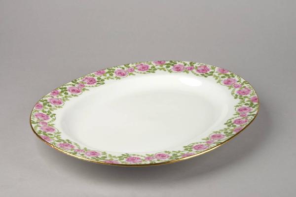 Piatto da portata ovale. L'ornato è costituito da rose di colore rosa, legate tra loro da un filo fogliato a volute e pendoni (di diverso disegno) in monocromia verde pisello; gli orli e i passaggi di piano sono sottolineati da fili d'oro.