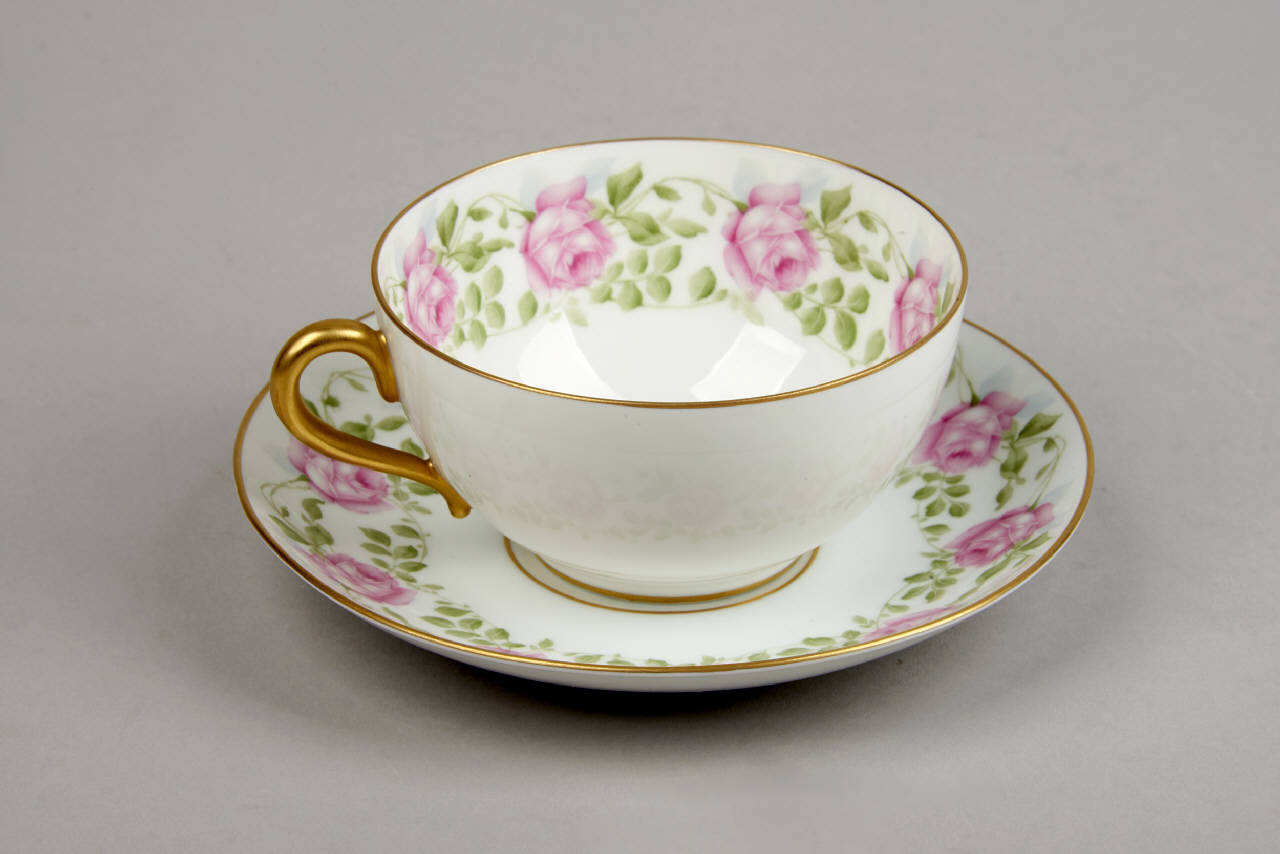 Servizio da thè composto da diciotto tazze e piattini in porcellana con decoro a decalcomania che corre all'interno delle tazze e sulla tesa dei piattini. Questo porta una fascia di bocci di rose rosa della stessa dimensione allineati e legati da sottili fili fogliati verde.