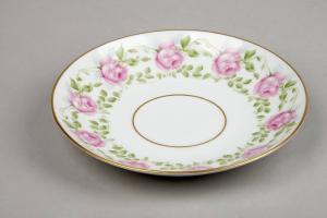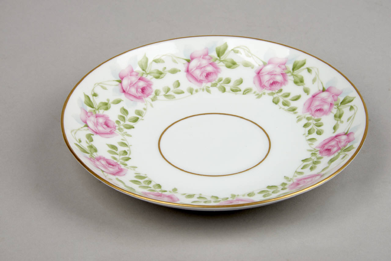 Piattino da thè con decoro a decalcomania che corre sulla tesa. Questo porta una fascia di bocci di rose rosa della stessa dimensione allineati e legati da sottili fili fogliati verde.