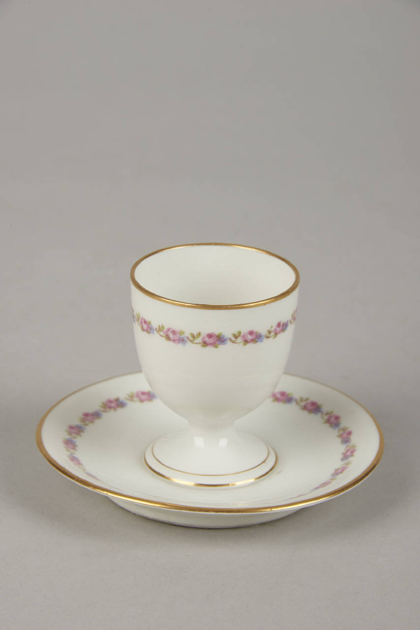 Portauovo con un motivo a nastro floreale in sottile rilievo. Da questo si sviluppa il decoro pittorico a decalcomania con un sottile catenella di roselline, "non-ti-scordar-di-me" e fogliette. L'orlo è dorato.