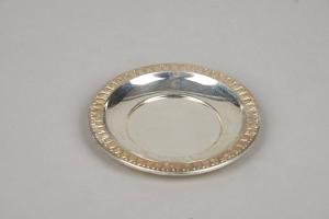 Piattino circolare in argento, con bordo decorato a sbalzo.