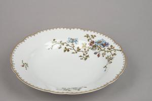 Piatto fondo in porcellana dalla tesa liscia e dall'orlo decalobato. La decorazione in decalcomania vede un motivo "a punta di frecce" dorato seguire l'orlo e un disegno floreale scendere dalla tesa, alla balza al fondo.