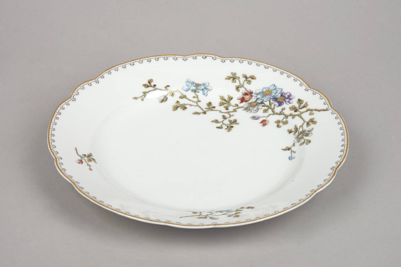 Piatto in porcellana dalla tesa liscia e dall'orlo decalobato. La decorazione in decalcomania vede un motivo "a punta di frecce" dorato seguire l'orlo e un disegno floreale scendere dalla tesa, alla balza al fondo.