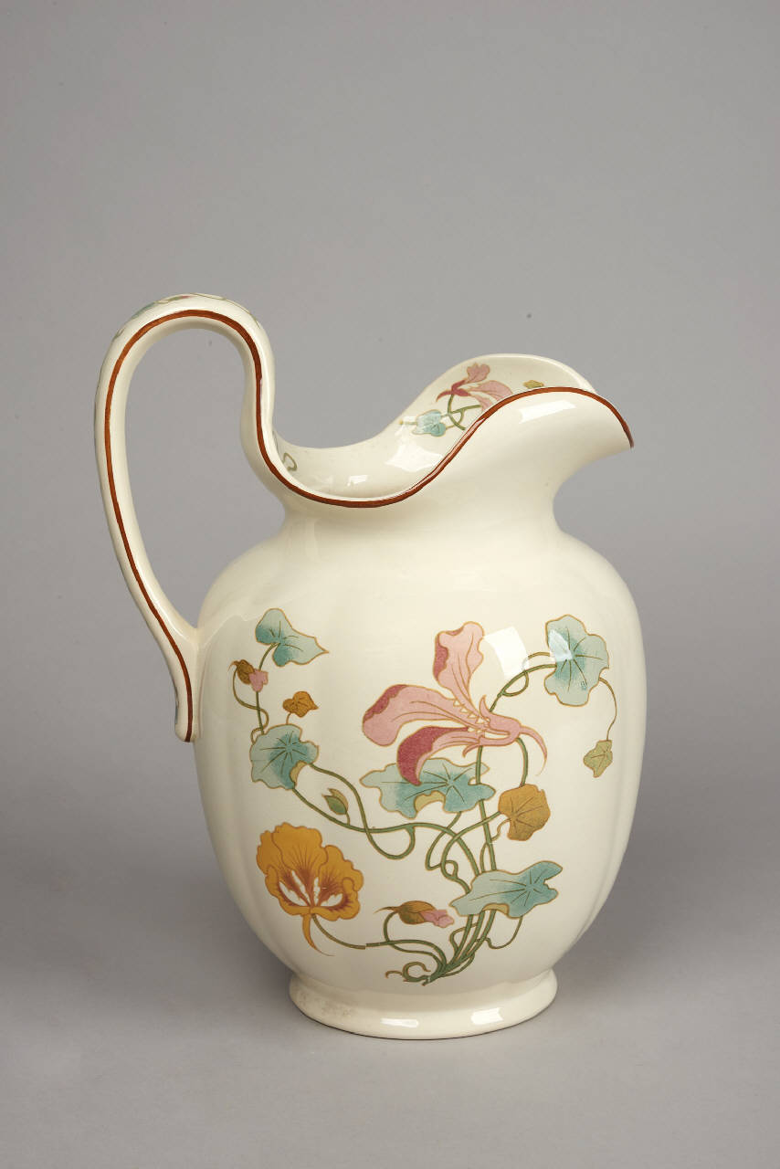 Brocca con corpo ovoidale rigonfio, versatore a becco dal modellato morbido e alta ansa a cordolo appiattito. La decorazione in decalcomania ha motivi floreali stilizzati disegnati e colorati in pieno stile Art Nouveau; gli orli e i profili plastici sono sottolineati con un filetto rosso scuro.