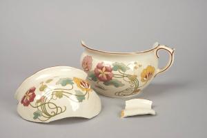 Vaso da notte tondo, ringonfio, a parete liscia e bordo estroflesso con ansa a cordolo e base ad anello dal fondo ribassato. La decorazione in decalcomania ha motivi floreali stilizzati disegnati e colorati in pieno stile Art Nouveau; gli orli e i profili plastici sono sottolineati con un filetto rosso scuro.