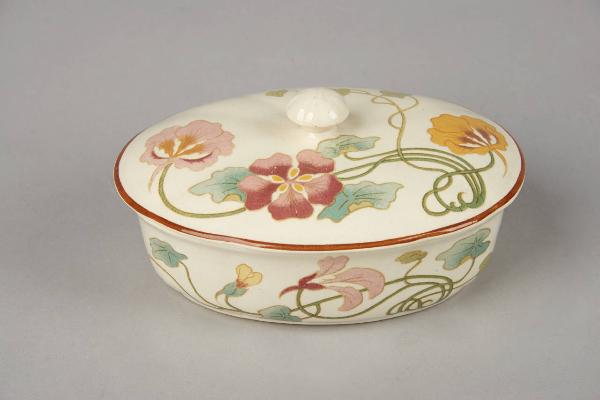 Portasapone ovoidale a parete liscia, dal coperchio appena rigonfio e presa a pomello. La decorazione in decalcomania ha motivi floreali stilizzati disegnati e colorati in pieno stile Art Nouveau; gli orli e i profili plastici sono sottolineati con un filetto rosso scuro.