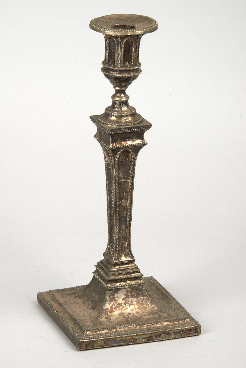 Candeliere a colonna con base quadrata, sormontata da portacandela a foggia di vaso all'antica. Profilature decorate con motivo a sferette.