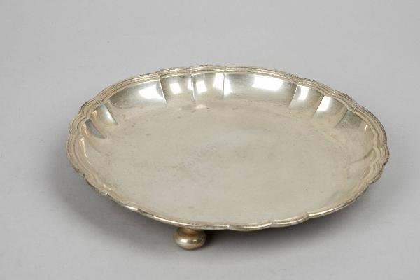 Piatto da frutta con piedini a sfera e profilo polilobato.