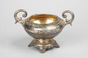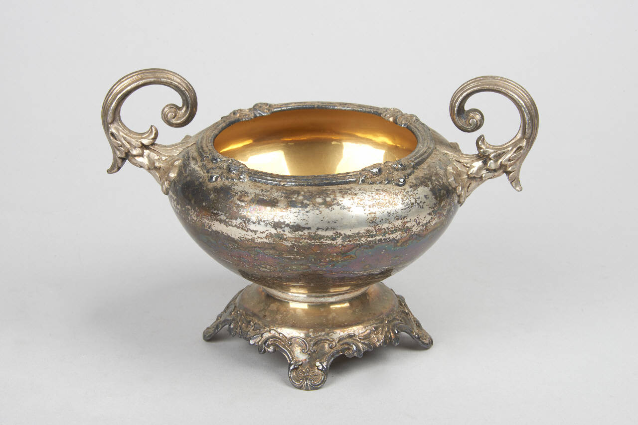 Zuccheriera in argento Sheffield plate con piede quadrilobato, corpo ad ovale schiacciato, manici a ricciolo simmetrici con decorazione a motivi fitomorfi. Mancante del coperchio.