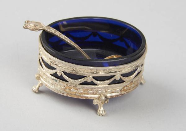 Saliera in vetro colorato blu con montatura ovale argentata a quattro piedini e decorazione a festoni.