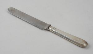 Coltello da dessert con manico in argento, lama a profilo rettangolare con punta arrotondata.