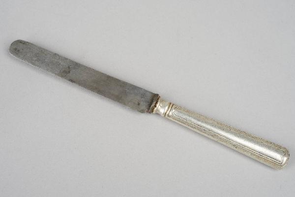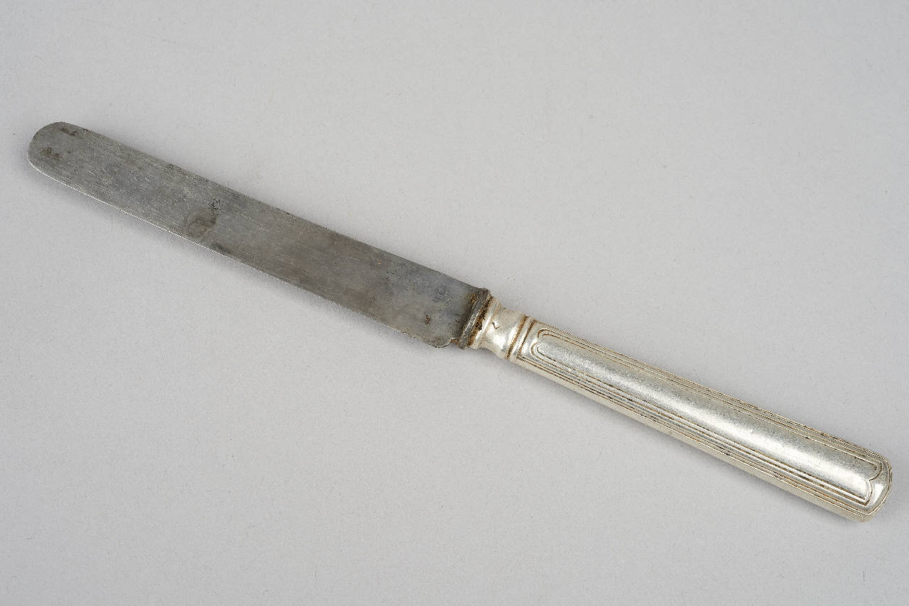 Coltello con lama rettangolare a punta tonda e manico argentato decorato con scanalature.