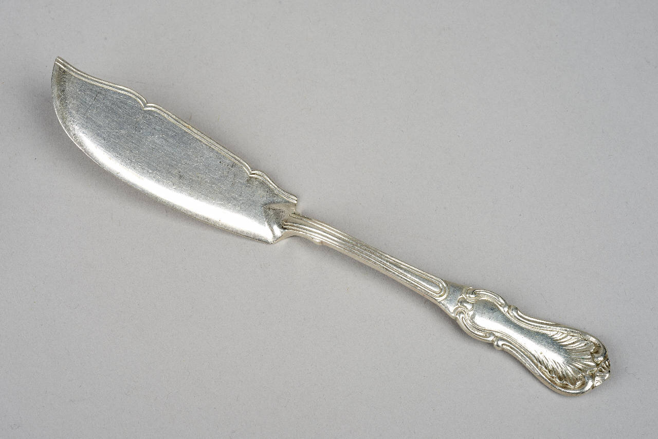 Coltello da pesce con manico decorato a motivi fitomorfi e punta a mezza luna.