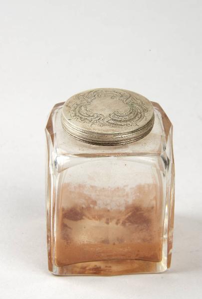 Vasetto portaprofumo a sezione quadrangolare in vetro sfaccettato e coperchio argentato con decorazione a volute floreali.
