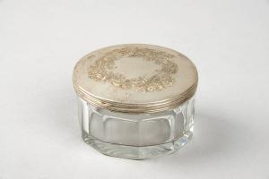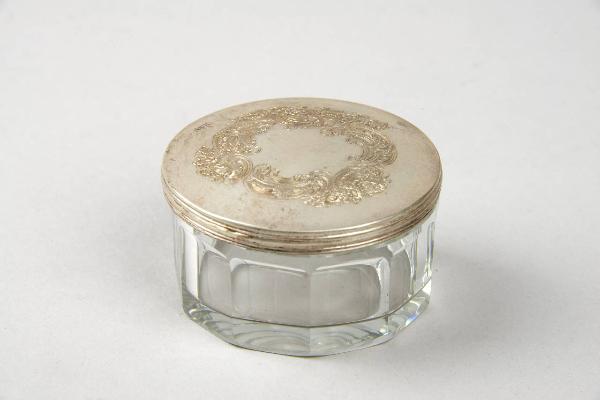 Vasetto portacipira a sezione circolare, corpo in vetro sfaccettato e coperchio argentato con decorazione a volute floreali.