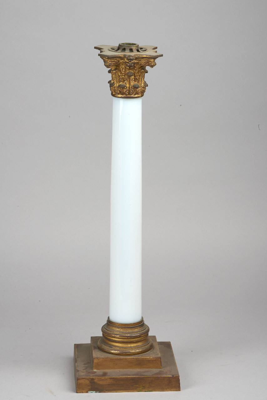 Candeliere a forma di colonna corinzia con fusto liscio in vetro opalino bianco, base e capitello in bronzo dorato.