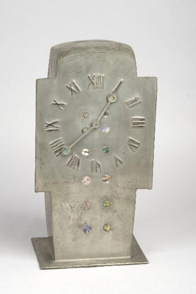 Orologio da tavolo in metallo a forma di parallelepipedo posto in verticale. Base rettangolare. Quadrante con indicazione delle ore in numeri romani e tondi in madreperla policroma.
