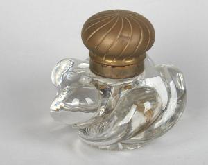 Calamaio con corpo in cristallo a base pentagonale e coperchio metallico a bulbo.