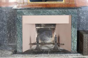 Semplice camino di marmo verde antico con pilastri lisci come la mensola molto aggettante. (F, Mazzocca)