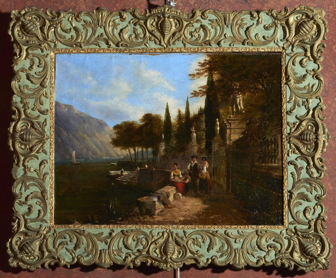 Veduta del lago presa dalla strada davanti a Villa Carlotta, di cui si vedono sulla destra la balaustrata con statue e gli alberi del giardino. Al centro sono raffigurati personaggi in costume tipico.