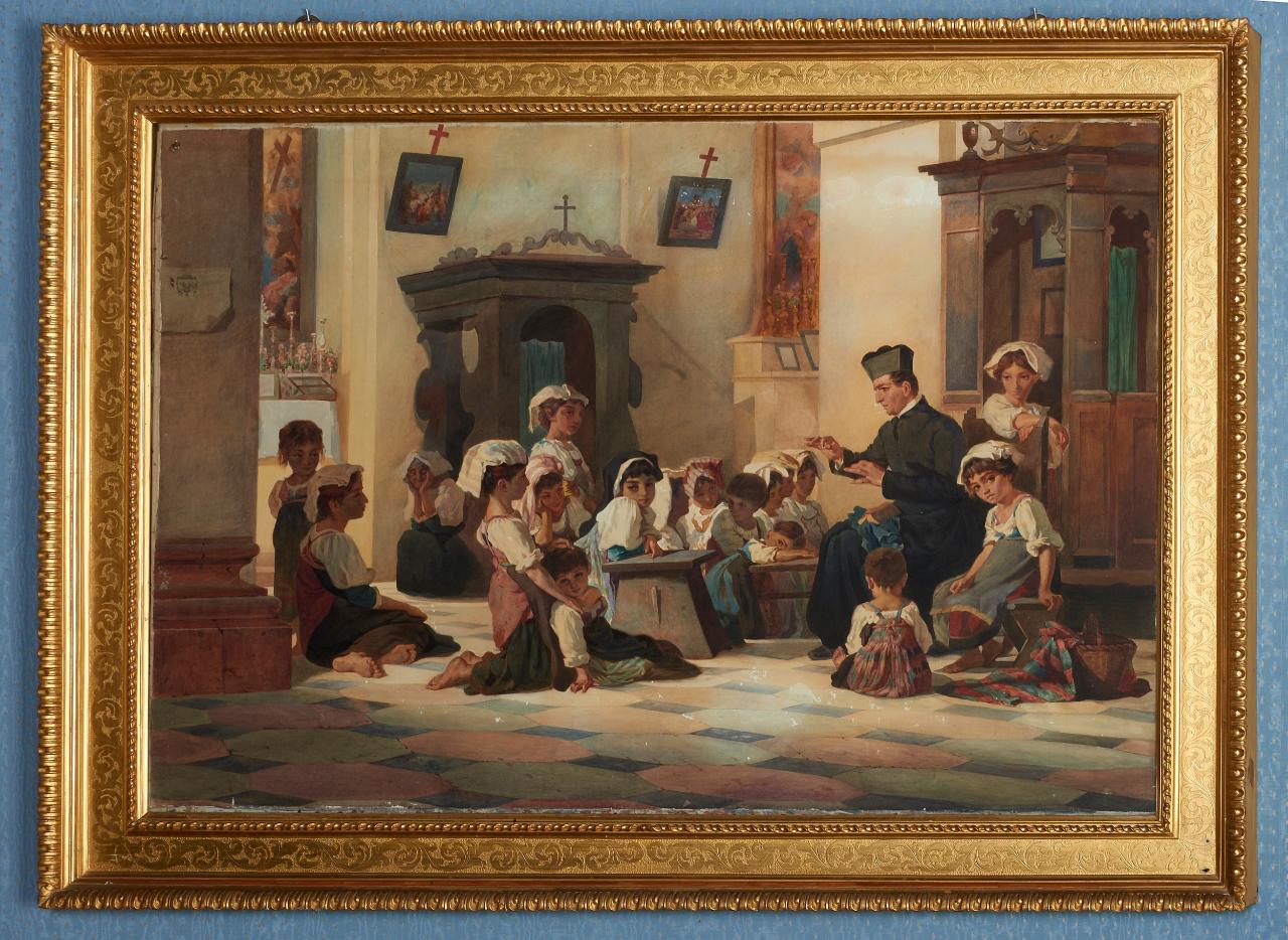 Dipinto a tempera e acquerello su carta applicata su tela raffigurante una lezione di catechismo in una chiesa laziale.