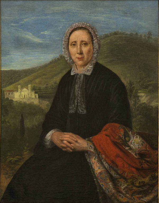 - NOTIZIE STORICO CRITICHE Teresa Semperboni, vedova del nobile Ottavio Boroni, fu benefattrice degli orfanotrofi maschile e femminile. Il dipinto fu realizzato probabilmente dopo la morte del marito (1836), come suggerirebbe l'austero abito nero, ma al momento non sono note le vicende che hanno portato all'esecuzione del dipinto. In modo convincente, l'opera è stata attribuita ad Angelo Inganni. Sullo sfondo è rappresentata l'ex chiesa di Sant'Emiliano in Valle Bresciana, di proprietà dei Boroni e donata alla Congrega della Carità Apostolica.