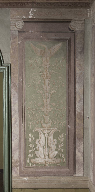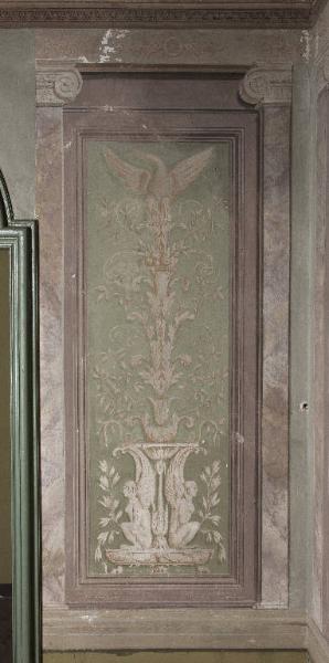 La decorazione pittorica si sviluppa sulla parete posta a destra dell'arco che introduce all'alcova. Si compone di una ampia specchiatura quadrangolare definita da una cornice violacea modanata e affiancata da due paraste ioniche e presenta, su fondo verde, un articolato motivo a candelabra.