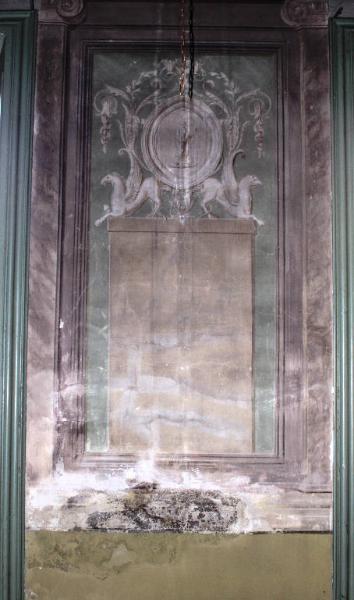 la decorazione pittorica si sviluppa nello spazio fra le due finestre e si compone di un'ampia specchiatura definita da una cornice modanata e affiancata da due paraste ioniche. Su fondo verde si staglia un alto podio sul quale si sviluppa un elegante motivo decorativo con due ippogrifi che sostengono un tondo incorniciato da racemi vegetali.