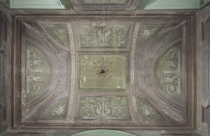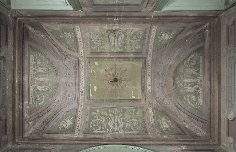 La decorazione si estende sulla volta ed è composta da due lunette e altrettanti riquadri raccordati da cornici modanate violacee. Su fondo verde si dispongono motivi a grottesche con animali mitologici e uccelli oltre che quattro trofei che simboleggiano le arti.