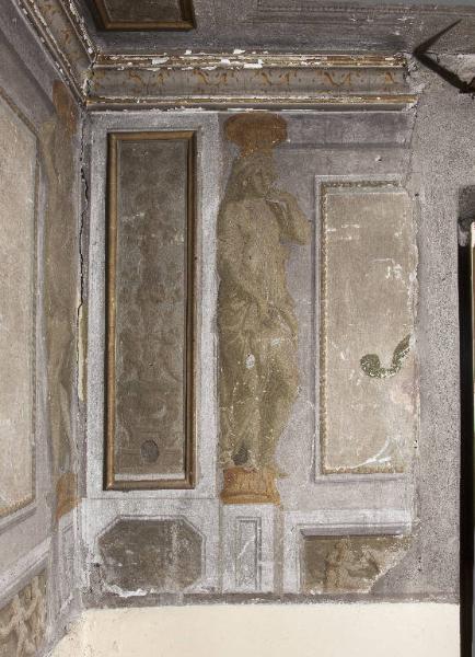 - NOTIZIE STORICO CRITICHE Nel 1782 muore Vincenzo Averoldi, ultimo erede in linea diretta maschile del casato Averoldi che aveva fondato e fatto costruire il palazzo di via Moretto e contrada Santa Croce a metà del XVI secolo. L'edificio e tutto il suo ricco contenuto passano per via ereditaria femminile (da Barbara Averoldi, sorella di Vincenzo sposata con Ferdinando Chizzola, del ramo di Erbusco) a Giuseppe e Faustino Chizzola. Assumendo anche il cognome Averoldi, i due fratelli si stabiliscono nel palazzo bresciano e avviano importanti lavori di ammodernamento e ristrutturazione del palazzo documentati dal 1787/88 fino alla fine degli anni Novanta del Settecento. Questo intervento è finalizzato ad adeguare la dimora signorile alle nuove tendenze dell'architettura francese estremamente attente alla distribuzione degli spazi interni e al rapporto fra forma, funzione, decorazione. Nell'ambito di questo intervento edilizio viene integrato nel corpo di fabbrica centrale un edificio già esistente nell'angolo nord-estdella fabbrica e vi si ricava un appartamento privato studiato per integrare e completare l'appartamento da parata. Ne fanno parte diversi ambienti di dimensioni piuttosto contenute, ma che conservano l'originaria decorazione ad affresco che presumibilmente fu realizzata nell'ultimo decennio del XVIII secolo. Si può ipotizzare, con una certa sicurezza, pur in mancanza di espliciti riferimenti documentari che l'autografia dei dipinti sia da ricondurre ai pittori, quadraturisti e decoratori già attivi e documentati nel resto del palazzo. Stefania Cretella riconduce a Giuseppe Teosa anche la decorazione pittorica di un piccolo ambiente che si trova a fianco della Sala del Camino. Grazie ad un inventario del 1828, sappiamo che gli affreschi tuttora esistenti erano completati, nella parte inferiore della pareti, da un rivestimento di pannelli di legni e specchi che ne facevano un raffinato "camerino degli specchi". Dato il tema icongrafico delle scene narrative che lo contraddistinguono legate a Cupido e all'infanzia, si può presumere che questo ambiente e quelli limitrofi che compongono l'appartamento privato, fossero di pertinenze di una signora di casa Averoldi.\nIl camerino degli specchi è stato adattato, nel secolo scorso, ad usi improri che hanno danneggiato la decorazione pittorica in generale ed in particolare la parete orientale: della composizione originale resta solo una parte dell'ornato architettonico.