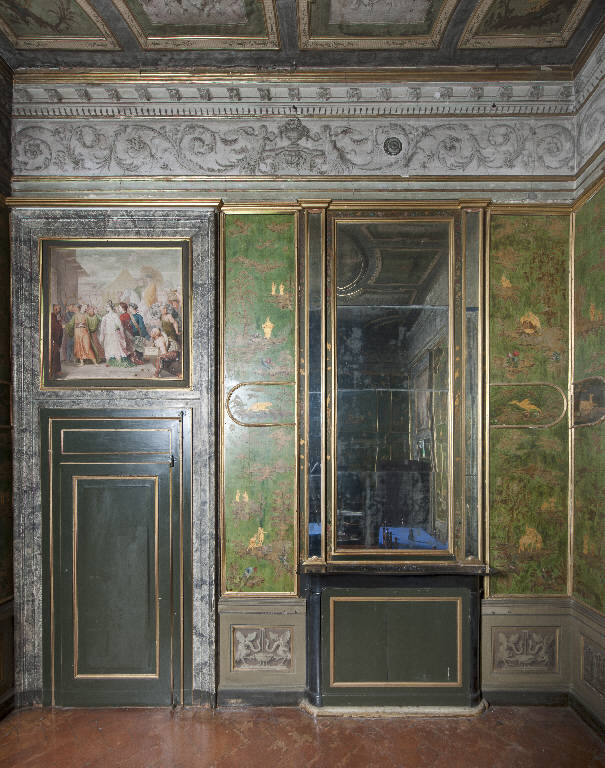 Il fregio dipinto corre lungo le pareti perimetrali ponendosi alla base della volta. Presenta un decoro continuo composto da girali vegetali che, in corrispondenza del centro della parete, si aprono in una sorta di trofeo composto da una valva di conchiglia sormontata da un un vaso con fiori retto da due figure fantastiche con corpo d'uomo, ali d'uccello e gambe che si perdono nei racemi vegetali.