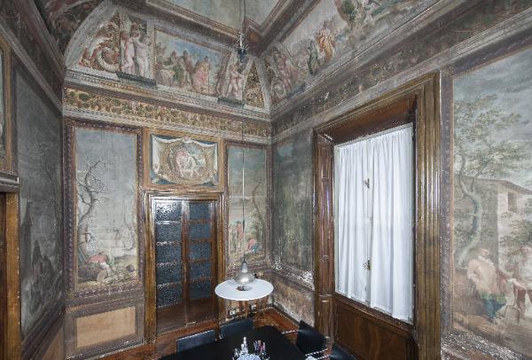 L'apparato decorativo coinvolge l'intero ambiente: sulle pareti ampi riquadri incorniciati da un torciglione illustrano i lavori stagionali della campagna dando ampio spazio alla rappresentazione del paesaggio; lungo il profilo superiore delle pareti è inserito un fregio continuo con motivi decorativi a tralci di vite che guida verso la volta. Qui una quadratura architettonica incornicia i partiti decorativi che alternano riquadri figurati con soggetti della letteratura e della mitologia greco - romana a vele con motivi decorativi fitomorfi, girali vegetali e putti. Nello spazio sopra le due porte vengono realizzati, ad affresco, due riquadri che imitano la struttura di un dipinto sovraporta: entro una cornice lignea si stende un drappo bianco frangiato in oro e raccordato alla cornice da un festone di fiori e frutti; al centro un tondo ospita la raffigurazione dell'episodio narrativo.