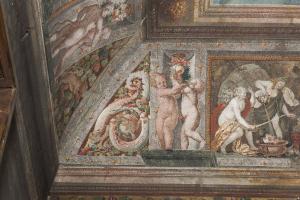 Il partito decorativo, definito da una cornice architttonica decorata da un elegante motivo stilizzato e dorato, si compone di una vela angolare decorata con tralci di vite e uva e una coppia di putti raffigurati mentre lottano scherzosamente.