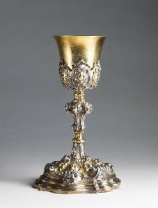 Calice a base polilobata con piede modanato; collo decorato da foglie d'acanto e volute fortemente rilevate. Fusto con nodo troncopiramidale arricchito da foglie dorate e volute che incorniciano cartelle decorate a bulino. Sottocoppa ornato da carelle a cartocci sormontate da una valva di congliglia alternata a un motivo di ispirazione floreale sormontato da foglie.