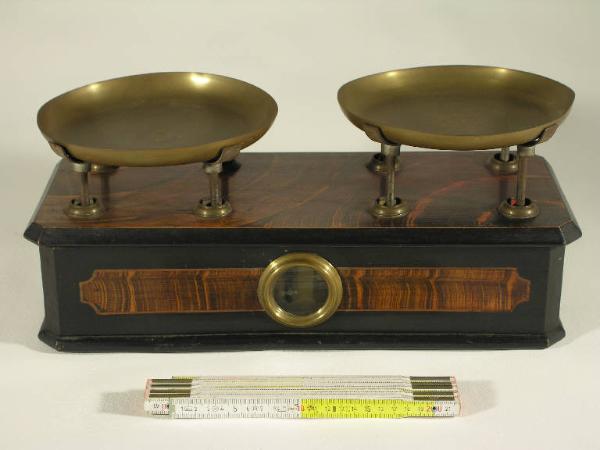 Bilancia a sospensione inferiore tipo Béranger. Base della bilancia in legno dipinto disegno radica. Due piatti uguali, in ottone, rotondi, a ciotola. Su entrambi i piatti: punzonatura "P. CINQUE CHILOG"; non sono presenti vidimazioni annuali; cartiglio con scudo crociato sovrastato da una corona; bollo rotondo con "238" sovrastato da una corona