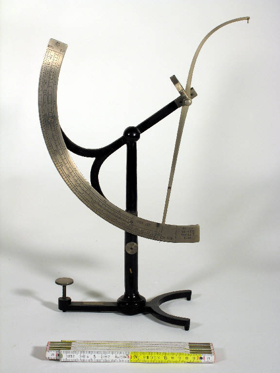 Bilancino titolatore, bilancia a pendolo. Lo strumento si compone di una colonna centrale che appoggia su un basamento a tre piedi, nell'uno dei quali si trova una vite micrometrica per l'esatto livellamento del bilancino sul piano. Un grande arco metallico, sul quale sfiora il braccio di un indice, segna direttamente in "denari" il peso del provino appeso al gancio portato dall'estremità superiore all'indice stesso. Sull'arco sono incise due scale: Scala "con peso" da 0g a 300g, con numero ogni 10g; graduazione ogni 10g e 2g. Scala "senza peso" da 0 a 50, con numero ogni 5 unità, graduazione ogni 5 e 1 unità. Un perno sulla colonna ospita un contrappeso circolare (che porta inciso "D 300") che serve per l'utilizzo del bilancino con la doppia scala: il contrappeso deve essere inserito (l'indice è dotato di un pernino per l'aggancio del peso) quando si pesano provini corrispondenti alla graduazione di peso maggiore e levato quando si pesano provini corrispondenti alla graduazione di peso minore. Alla base delle due scale "Per Seta - Giri 400 - Metri 450 - P. Dec.": è l'indicazione di come deve essere preparato il "provino" di seta per la determinazione del titolo con questo strumento. Etichetta metallica: "Premiata ditta T.Speroni di R. Pedroni - Fabbrica Pesi e Misure - Articoli per Setifici - Milano - Negozio Via Orso 5, Telef. 85664 - Officina: Via Degli Imbriani 81, Telef. 60387". Etichetta adesiva faccia posteriore "O.R.M.A. Milano - Apparecchi Scientifici - Via S. Vittore 27, Tel 432913".