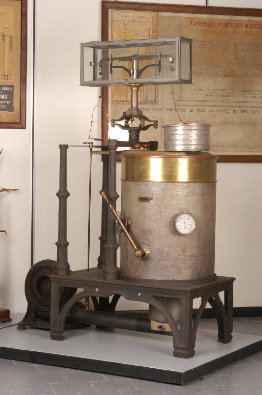 Il corpo centrale dell'apparecchio è formato da una stufa cilindrica di lamiera zincata, a due pareti, formantiuna intercapedine isolante riempita di materiale coibente. Questa stufa è rivestita internamente da una camicia di rame concentrica, nel cui interno si trova un secchiello, pure di rame, in cui viene collocato l'apposito cestello di alluminio contenente il materiale da stagionare. Il cestello ha il fondo formato da rete metallica e può essere appeso al braccio della bilancia mediante una catenella. L'aria, spinta dal ventilatore, giunge per mezzo di una tubazione al dispositivo elettrico di riscaldamento sistemato sotto il basamento dell'apparecchio, e così riscaldata arriva al cestello, attraversam il matreriale da stagionare ed esce per un condotto che immette in un camino di tiraggio. Una leva di comando con impugnatura in legno permette di girare la valvola che si trova fra il cilindro di rame ed il dispositivo di riscaldamento (così tutta l'aria viene convogliata direttamente al camino di tiraggio, così che si pesa in perfetto stato di quiete). La regolazione della temperatura avviene automaticamnte per mezzo di un relais ("autointerruttore termico"), che inserisce e disinnesta una resistenza sussidiaria del dispositivo di riscaldamento a seconda che la temperatura tenda ad abbassarsi o innalzarsi rispetto a quella stabilita, che viene segnata su un apposito quadrante graduato mediante un indice spostabile a mano. La temperatura interna viene letta sul quadrante circolare presente all'esterno della stufa, graduato fino a 160°C. Fusione sul corpo motore: "Ing. Giampiero Clerici & C. - Milano". Etichetta metallica sulla stufa: "Giuseppe Acquati - Officine Meccaniche di precisione - Costruzione di istrumenti per l'industria serica, laniera, cotoniera e fibre tessili - Via A. Aleardi 14 - Milano - Tel 91-423". Punzonatura alla base della colonna della bilancia: "Società Anonima Cooperativa per la Stagionatura e Assaggio delle Sete"