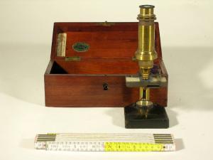 L'oggetto completo è costituito da un microscopio, un oculare di ricambio, tre vetrini e una cassetta di legno\nLo strumento ha un piede di ferro verniciato che sostiene una colonna rigida con una piattaforma rettangolare. Sotto la piattaforma si trova uno specchietto orientabile e un condensatore munito di diaframma. La messa a fuoco fine è regolata da una manopola, mentre per quella di avvicinamento il tubo ottico scorre nella propria sede. Due etichette in carta all'interno del coperchio della cassetta: "Stagionatura e Assaggio - Sete - Alle dipendenze del Consiglio Provinciale dell'economia di Como" e "Officina Ottico-Meccanica - Specilaità in microscopi - F. Koristka - Milano - Via del Circo n.14 " . All'interno del coperchio è puzonato il numero: "1089"